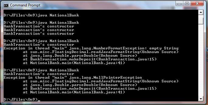 The second is whenever the user presses cancel at a position where I had not put in place the "== null" check. One problem with this is when the programme loops I can't put this check in place properly hence on the first round it terminates properly, but once it loops it shows the error message. Another time this shows is when the "BankTransaction" file runs and the user presses cancel at the "enter deposit/withdrawing amount". This problem hopefully I'll find out how to solve soon.